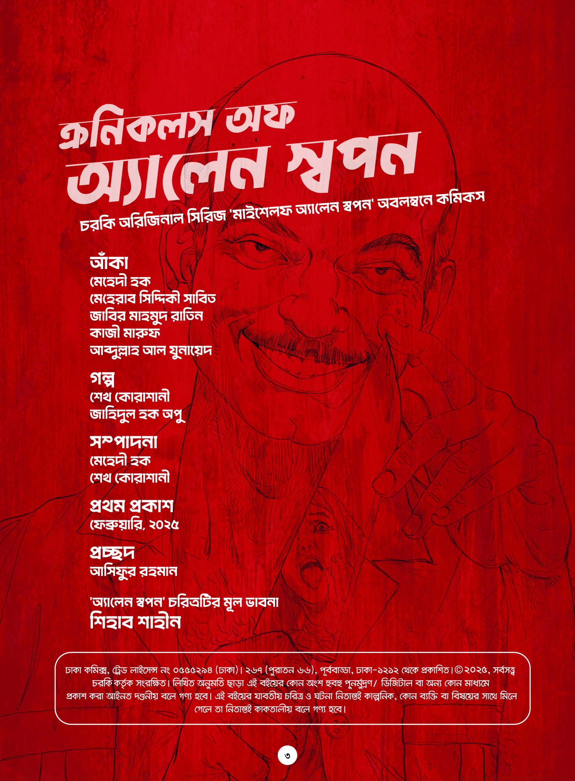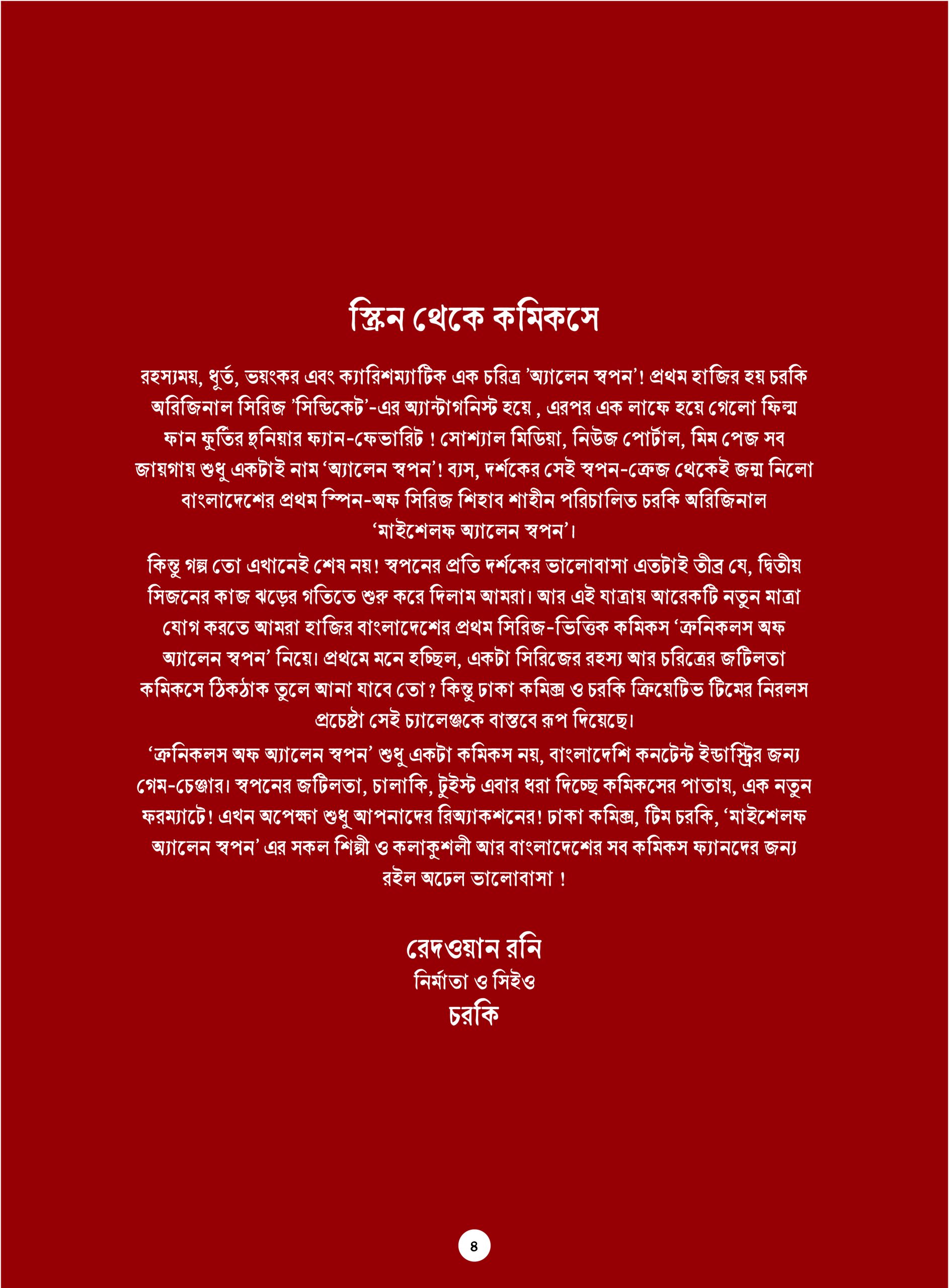 ‘ক্রনিকলস অফ অ্যালেন স্বপন’ শুধু একটা কমিকস নয়, বাংলাদেশি কনটেন্ট ইন্ডাস্ট্রির জন্য গেম-চেঞ্জার। স্বপনের জটিলতা, চালাকি, টুইস্ট এবার ধরা দিচ্ছে কমিকসের পাতায়, এক নতুন ফরম্যাটে! এখন অপেক্ষা শুধু আপনাদের রিঅ্যাকশনের! ঢাকা কমিক্স, টিম চরকি, ‘মাইশেলফ অ্যালেন স্বপন’ এর সকল শিল্পী ও কলাকুশলী আর বাংলাদেশের সব কমিকস ফ্যানদের জন্য রইল অঢেল ভালোবাসা !